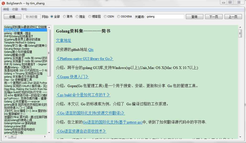 之前写过一个简书查询的软件过于简陋,有一些bug,使用起来不是很方便。 我就想到写个集合几个blog网站带收藏功能的软件,这就有了博客查询这个小软件。