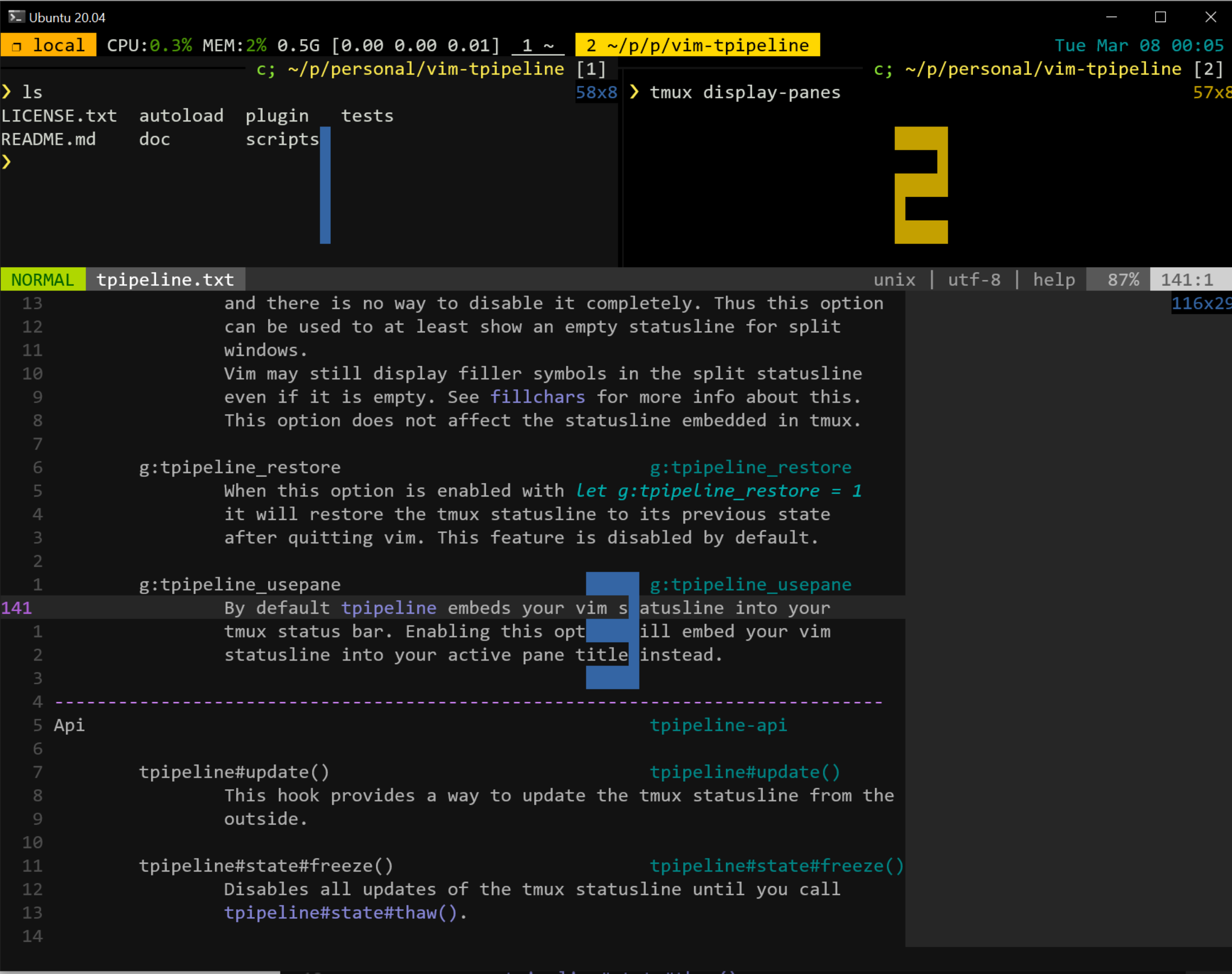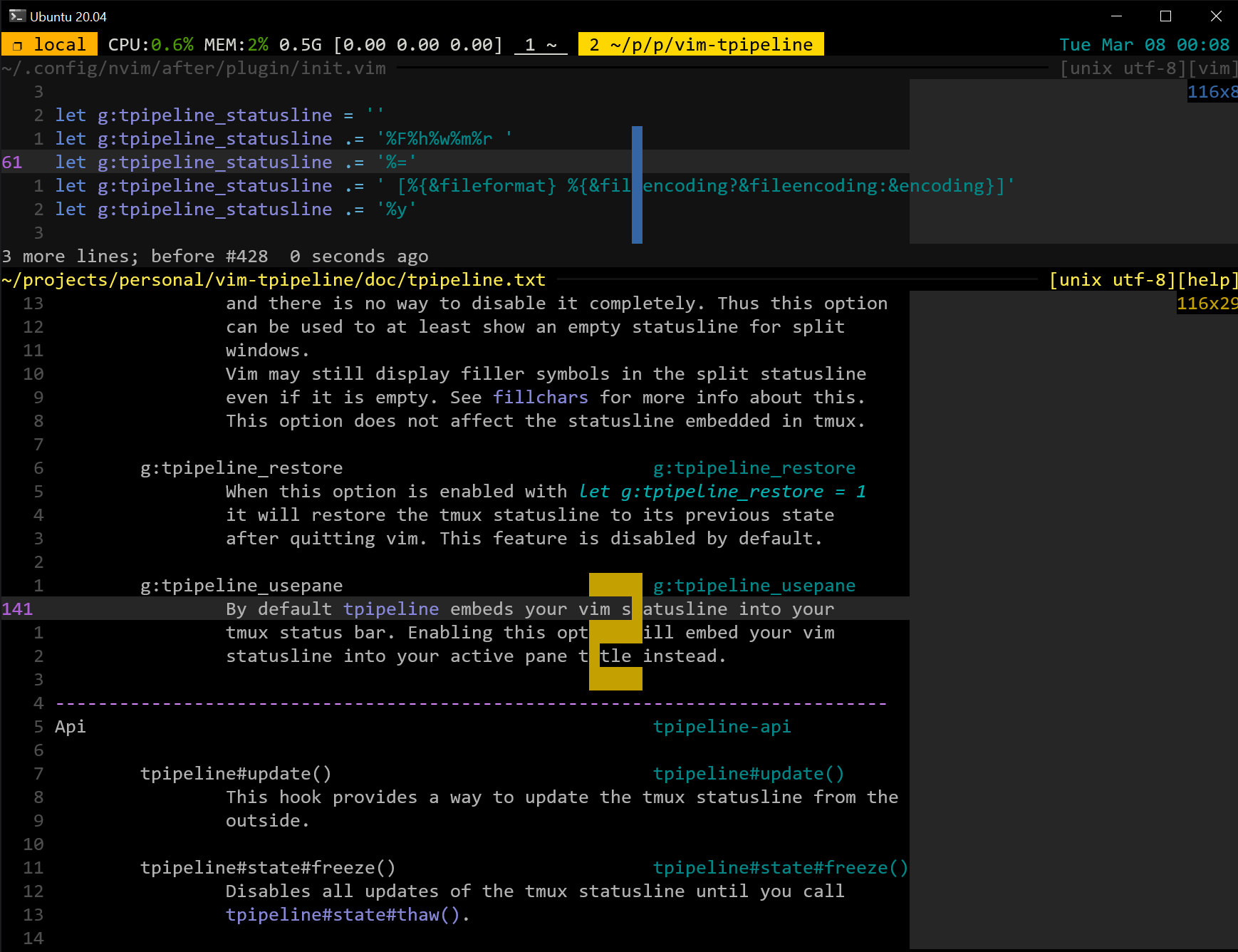 option, but this didn't work out too well because it applied to every pane border. Luckily it wasn't too difficult to get the behaviour I was looking for! Here's an example with the default lightline-esque statusline as the pane title with the following options:It also works with a custom status line too (that can be colored in the pane-border-format):