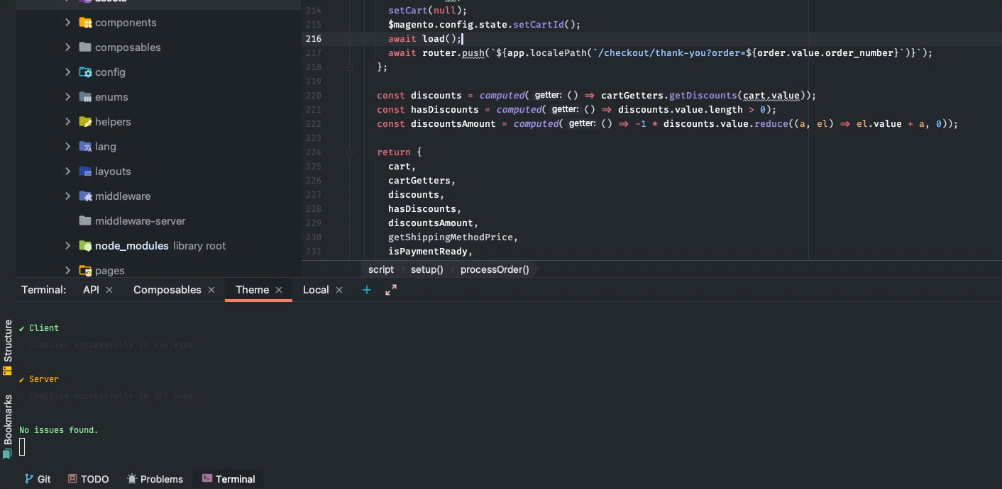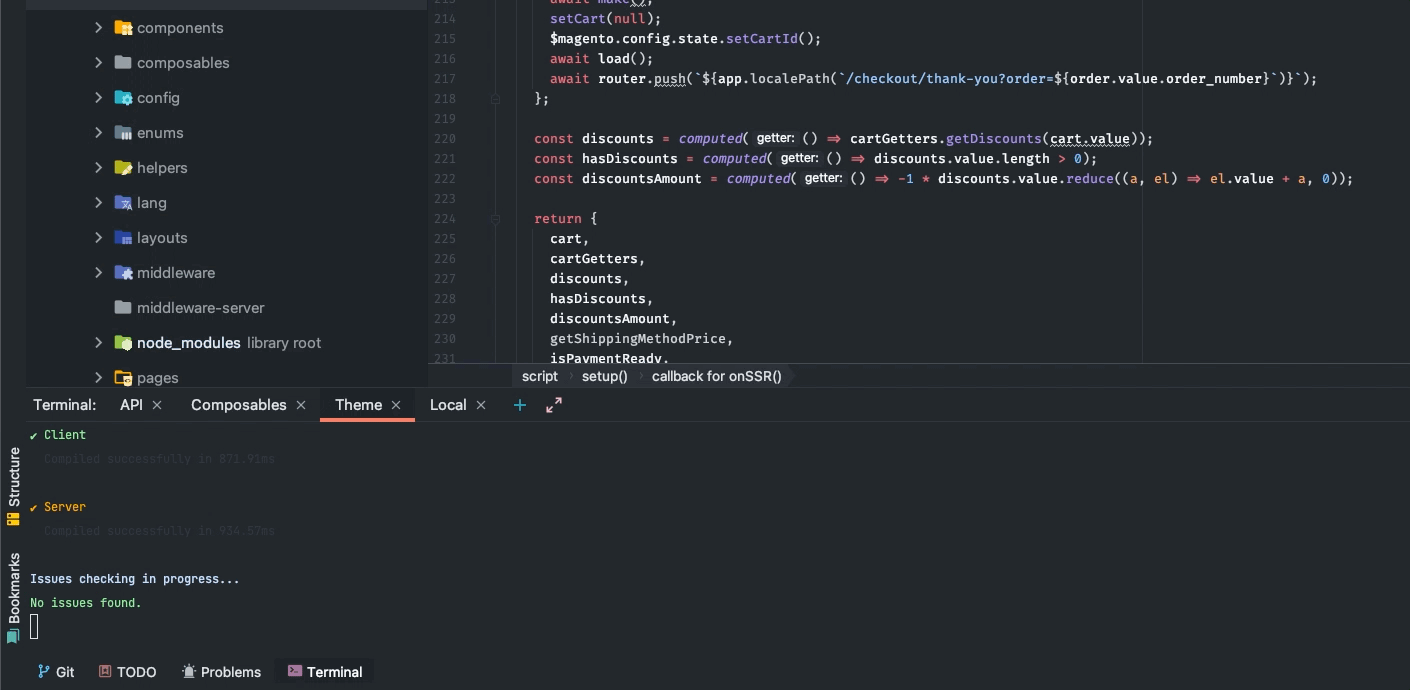 * fix(theme): fix dompurify arguments injection (#573) Co-authored-by: Bartosz Herba <[email protected]> * feat: mobile menu (#569) Co-authored-by: Alexander Devitsky <[email protected]> * chore: fixed some error reported by eslint (#562) * chore: fixed some error reported by eslint * refactor: removed unnecessary type file * fix: small fixes for mobile (#580) * fix(theme): show currency-switcher on mobile * fix(theme): only show login-modal when user isn't logged in * build(dockerfile): binded MAGENTO_BASE_URL to the env variable (#597) * fix(build): changed image provider to ipx (#599) * refactor(general): refactor how and where the cart is loaded - add loadTotalQuantity method on the cart composable as sometimes this is the only information needed - add lazy load for a minicart - header will pull only total quantity data instead of loading whole cart * feat(theme): add conditional rendering for a store switcher and currency switcher - if there is less than 2 currencies/stores relevant switcher will be not displayed * build(tsconfig): changed target in tdconfig files from es5 to es2019 * build(github actions): updated draft release and merge release GH actions * refactor(theme): moved loadStores and loadCurrencies to separate components * refactor(theme): refactored store switcher * refactor(theme): refactored currency swithcer * feat(theme): added useApi composable, refactored topBar - added useApi composable to use GraphQL APi on the client side * chore(composables): made useCustomQuery composables deprecated * feat(theme): - add wishlist lazyload and totalItems shared field * perf(theme): lazy load loginModal * feat(theme): add LoadWhenVisible component and lazyload footer - update social icons to reduce weight and increase quality - load footer only when visible * refactor(theme): changed VSF logo and favicon * refactor(theme): fixed cms pages layout * build: added redis * build: fixed redis cache invalidation * build(build): fixed merge-release GH action * fix(theme): clear login modal reset password data when modal is closed * refactor(theme): add homepage missing german translations * perf(theme): appHeader navigation improvement - add @nuxtjs/device package to recognize used device - remove mobile observer from header and replave it with device recognition tool - navigation is now lazy loaded, categories required for a navigation are not loaded at all on mobile devices * build(deployment): changed URL of Magento backend * fix(redis): added missing redis config * refactor(theme): refactor SearchBar component - move search bar component to components/Header - remove unused code and watchers * fix(config): fixed redis__enabled varaible binding * build(cache): enabled varnish * fix(api): fix cart_id graphql error * fix: centered empty cart text and image * feat(theme): add sorting select in the navbar on the mobile category view * fix(theme): [Category] Save for later button should be hidden for guest user * fix(theme): [My Account] Aligned State/Province input * chore(theme): Product removal confirmation out of viewport * fix(theme): added radio-button filter for mobile * fix(theme): refactored how the selected filters values are set * feat: asset Optimization * feat(theme): add pagination on the category mobile view * fix(theme): [Product] Fixed Additional information tab * refactor: optimized build, fixed small bugs * fix(myaccount): fix few bugs on my account - fix hydration issues - rework and fix reviews composable - add import of missing email validators - fix readonly computable error in the app header * refactor(theme): made TopBar component lazy loaded * refactor(theme): fixed cache issues * fix(theme): refactored when clicking outside the search-results * fix(theme): better aligned search input icon * fix(theme): refactored watcher * chore: updated readme * refactor(theme): category page refactoring step-1 - separate category page and sidebar logic - add resolving layput configuration on category page - move navbar to a separate component - add redis cache for the sidebar - add empty results page * chore(theme): Customer cannot change their email on mobile * Update package.json * fix(theme): center wishlist `<SvgImage>` vertically this is not based on any Figma designs - just aligning `WishlistSidebar.vue` with `CartSidebar.vue` This is a fix ONLY for the desktop version. There's still a few px of vertical difference between the `<SvgImages>` on mobile CartSidebar and mobile WishlistSidebar, but that's because one of them has a text header and the other doesn't (separate issue) * fix(theme): add products from list view with correct quantity Also made some minor eslint fixes since I "touched" the file and husky started detecting them * feat(theme): add basic skeleton loader component * build: refactored precommit hooks execution * fix(theme): better looking default shipping/billing address badges * fix(M2-146): Correct desktop order history column alignment * fix(theme): fix error when adding single quantity product * feat: migrate to ESM and esbuild * chore: revert few changes * chore: restore yarn.lock in docs * docs: update TypeScript and yarn.lock * chore: revert changes that require Node 16 * chore: revert changes * chore: improve dev command in api-client * fix(theme): fix cart's product url resolving for a configurable products * chore: allign main to develop after 1.0.0-rc.6 release (#697) * Fix useFacet(...) customQuery implemention (#413) * chore: release 1.0.0-rc.5.3 (#437) * chore: add gitflow actions (#379) * chore: added base gitflow actions * chore: added base gitflow actions * chore: fixed versioning process * docs: added roadmap to the docs (#380) closes #323 * fix(theme): refactor and fix store switcher (#383) - update nuxt.config.js to handle de translation - fix issue with flag icon #362 - refactor store switcher component - add store name next to the language icon flag - add translation info in docs Co-authored-by: Bartosz Herba <[email protected]> * 