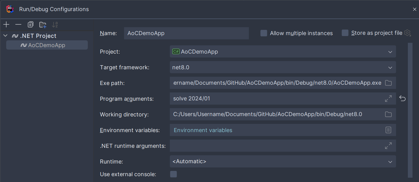 For example, in JetBrains Rider, you can set up a run configuration and set the arguments in the Run/Debug Configurations