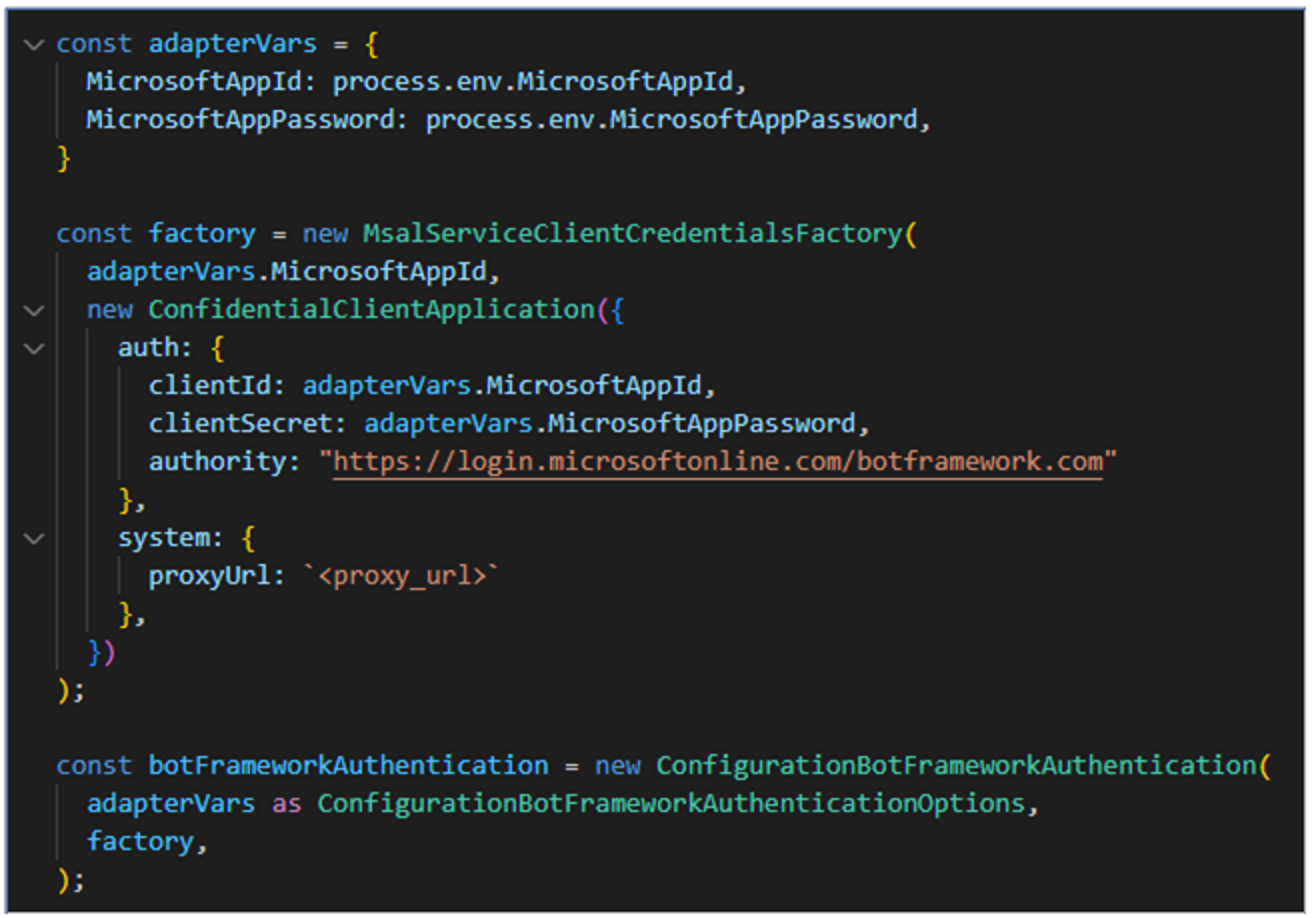 The introduction of MSAL in 4.21.0 encountered an issue when used behind a proxy. This version adds an additional way to specify proxy settings. This does require a change to the bot startup code if required.
